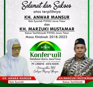 Konferwil NU Jatim di Pondok Pesantren Lirboyo memilih KH Anwar Mansur dan KH Marzuki Mustamar menjadi Ketua Rois Syuriah dan KKetua Tanfidziyah Pengurus Wilayah (PW) NU Jatim masa bakti 2018 – 2023, Minggu (29/7/2018).